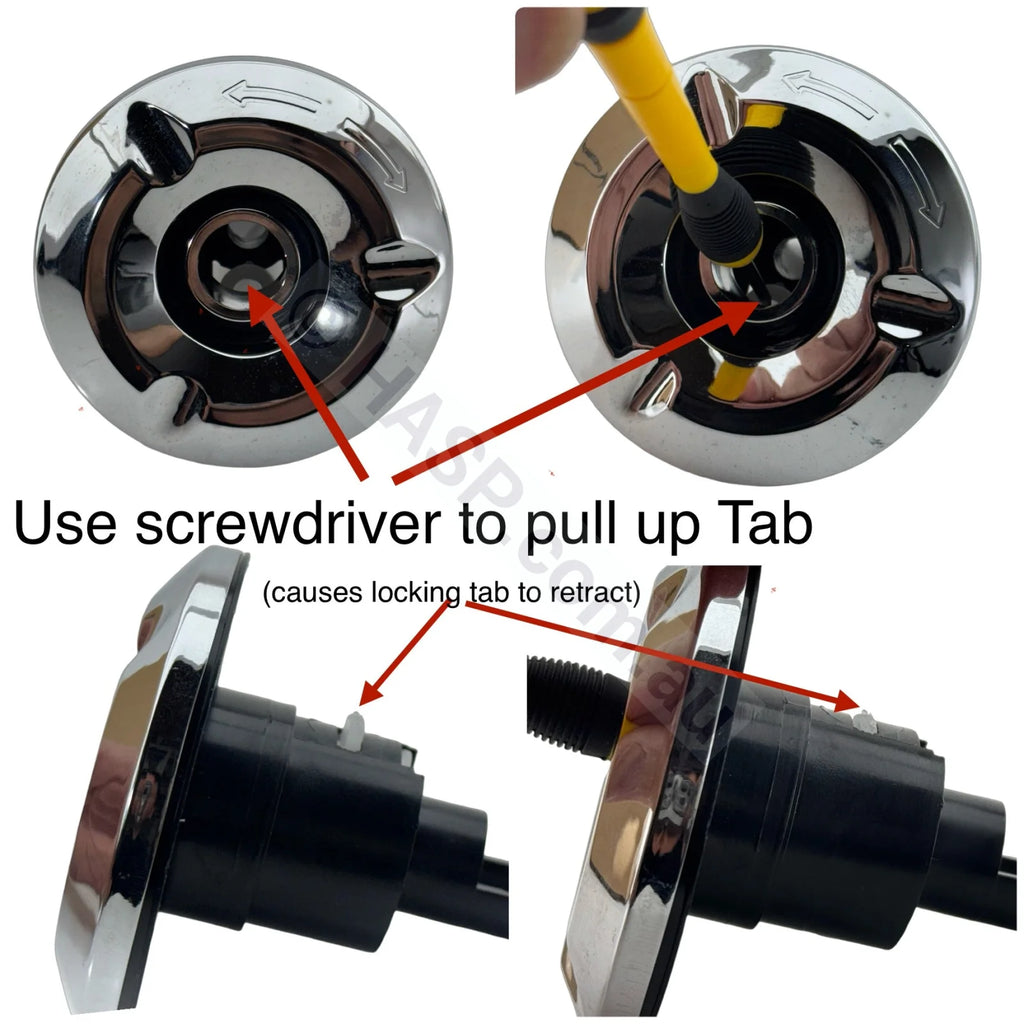 To remove these jet internals, insert a small flat screwdriver inside the eyeball into plastic D ring. Then pull screwdriver blade towards centre to unlock the jet. Simply pull out. See photos.
