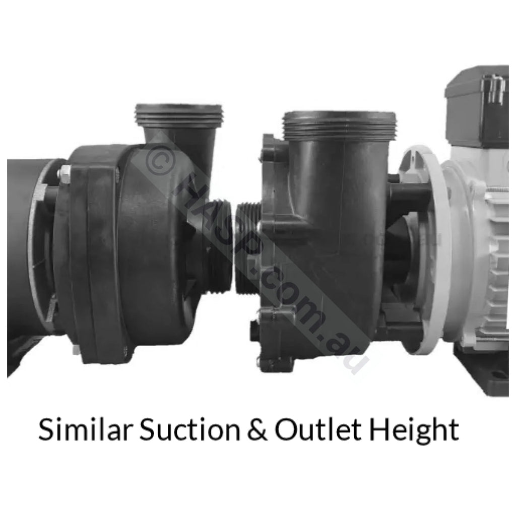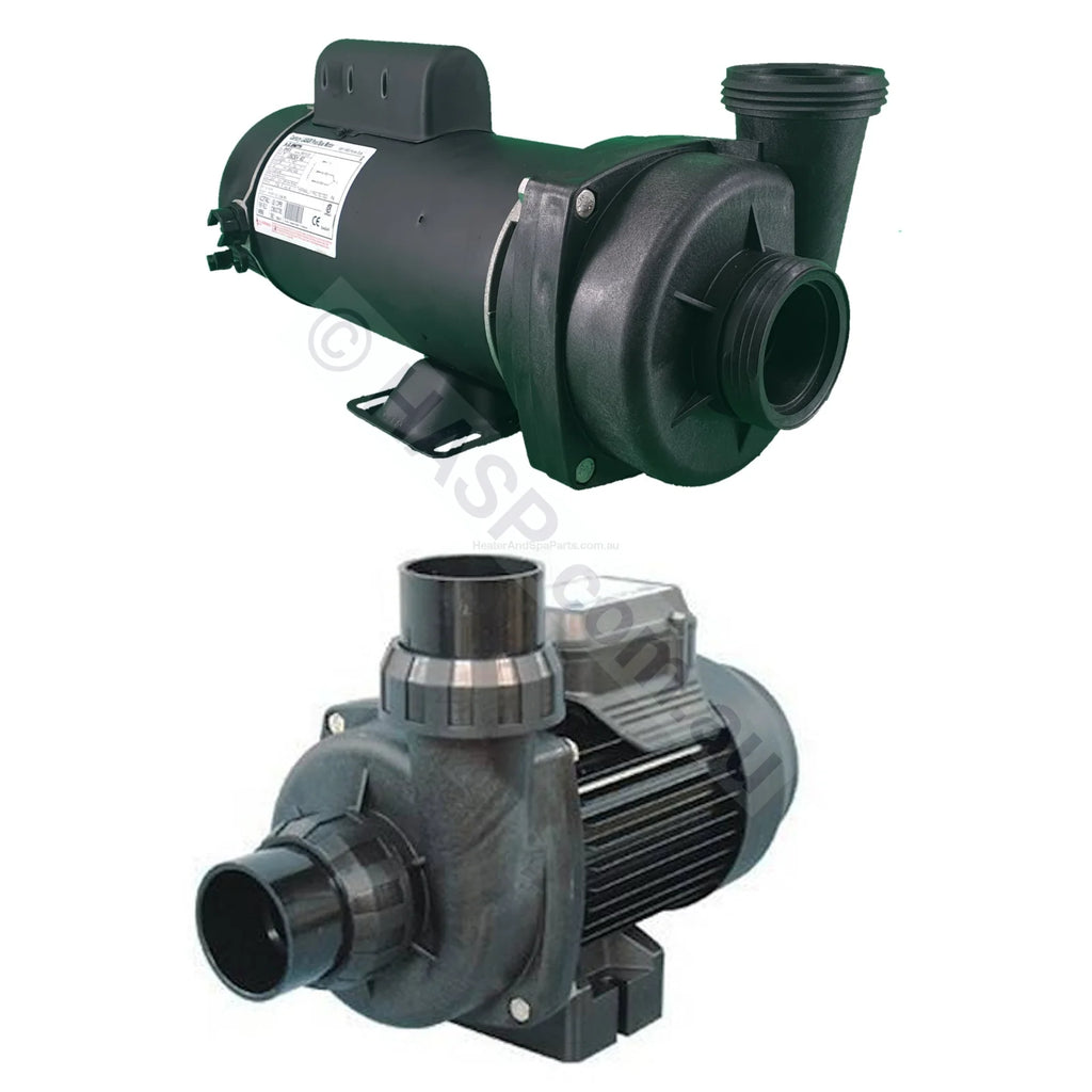 See photos for comparison of old types to the new types. Note that Spa-Quip used to use "Nominal" Horsepower ratings, so the 'Named' HP was not accurate at all. Pumps labelled 3HP might actually only be 2HP motors, and so on.