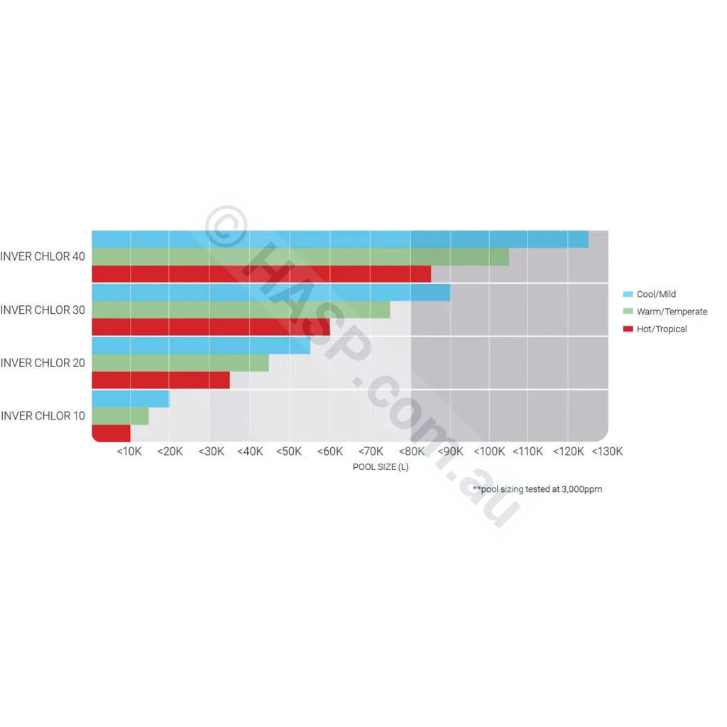 30gm Madimack InverCHLOR 300 handles up to*: 60,000L in Tropical or Hot Climates, 75,000L in Temperate or Warm climates, 90,000L in Cool climates – The Intelligent Salt & Mineral Chlorinator - Smart, Efficient & Hassle-Free Pool Sanitization. Retrofits Astralpool & Hurlcon chlorinators.