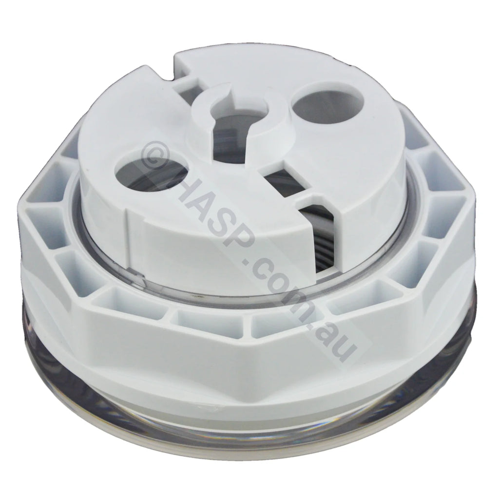 Common spa light body fitting used in older Spa Industries' built spas such as Signature Spas, Bullfrog, Designer, Leisureite and others. Approximately 125-127mm diameter face, and requires a 95-97mm hole. Branded Rising Dragon and others.