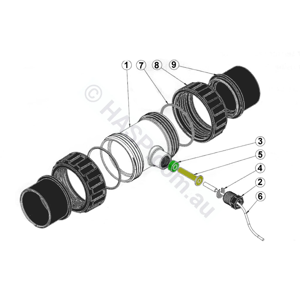 Astralpool Temperature Sensor Kit Spare Parts. Many parts also shared with Chemical Injection bodies. Eg, Cable Gland Nut, Green Grommet, Nut, Tail, O-rings.
