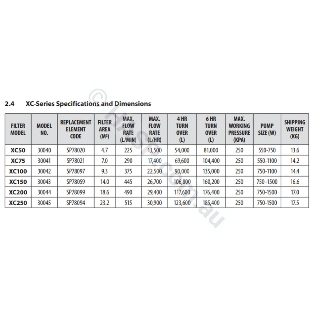 The AstralPool XC75 filter replaces the old ZX 75 (ZX75) and is a compact-designed single element filter with a small footprint. A perfect product where space maybe a constraint. With no backwashing required, this is an ideal filter where wastewater disposal or water restrictions are in force. Australian designed and manufactured, the XC range filters provide superior quality filtration along with an environmentally friendly and responsible use of water.