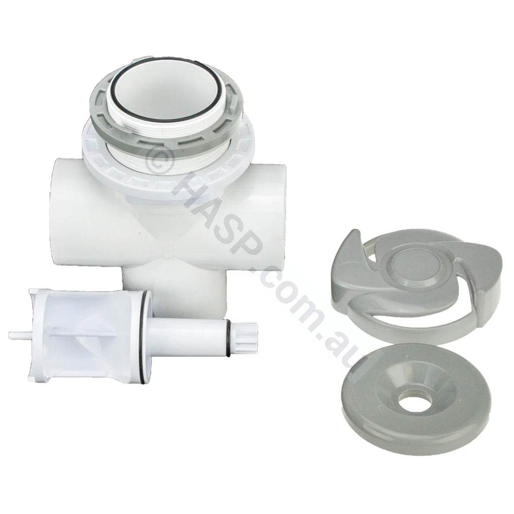 Balboa 3 way diverter valve. Common on many Australian spas. They also came with chrome caps & dark gray, but are currently only available in a light gray. The gate stem can break if the body has sand or grit stopping it from moving.