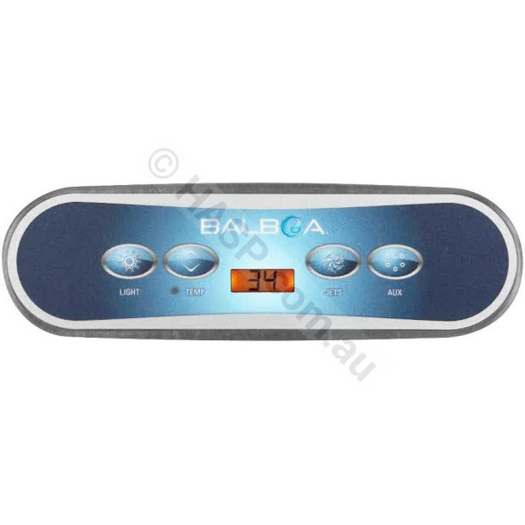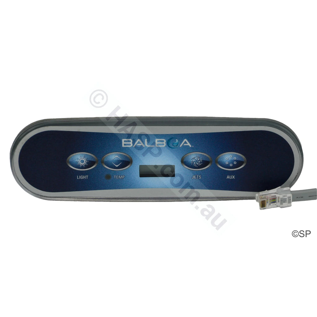 Balboa VL 400 4-button touchpad. Used on some Chinese and Elite imported spas. Used on VS/GS systems. Has RJ45 plug. Button layout: Light and Temp on left of display; Jets and AUX on right of display.