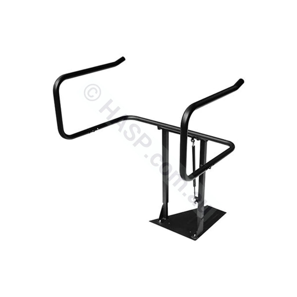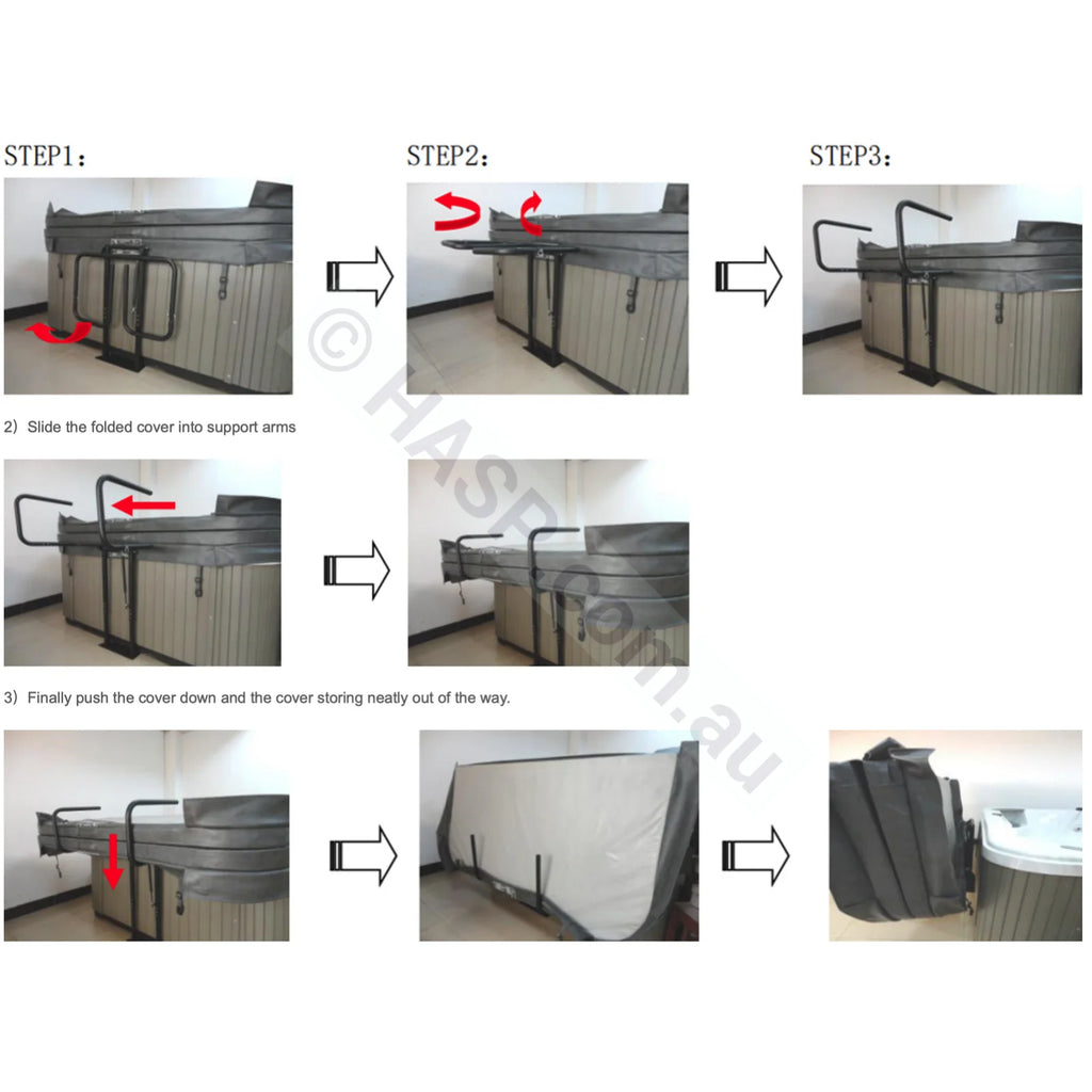 A premium under-mount basket-style spa cover lifter for square and rectangular spas. Supports both hinged and individual section covers (up to 2 sections) and features a hydraulic strut for easier lifting and lowering. No cabinet drilling required.