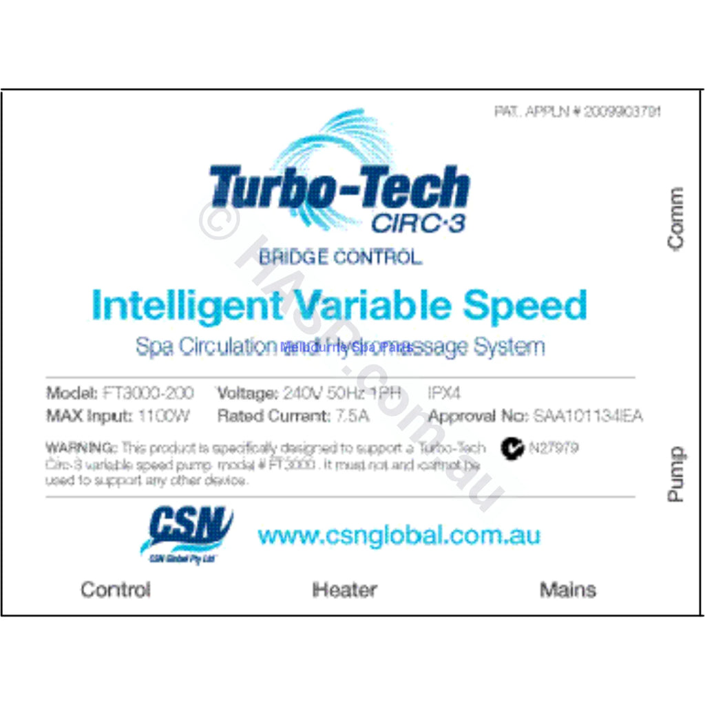 Intelligent Variable Speed Drive for CSN Turbo-Tech Circ-3 variable speed pumps. The intelligent Bridge Control selects the most efficient speeds for filtration, heating & jet performance Super Quiet, Super-efficient brushless DC variable speed motors. Up to 8-star energy rating.