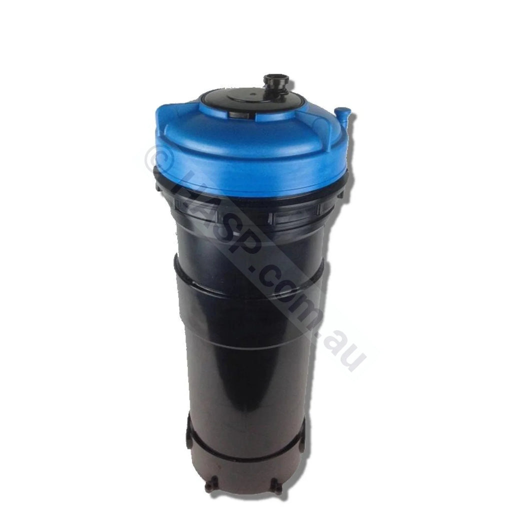 Common filter for older spas. Can be mounted on the floor, or in the corner of the Top load filter with 50mm / 2" plumbing seats through 175mm diameter hole in shell or niche. Overall height is approx 600mm to top of bleed valve.