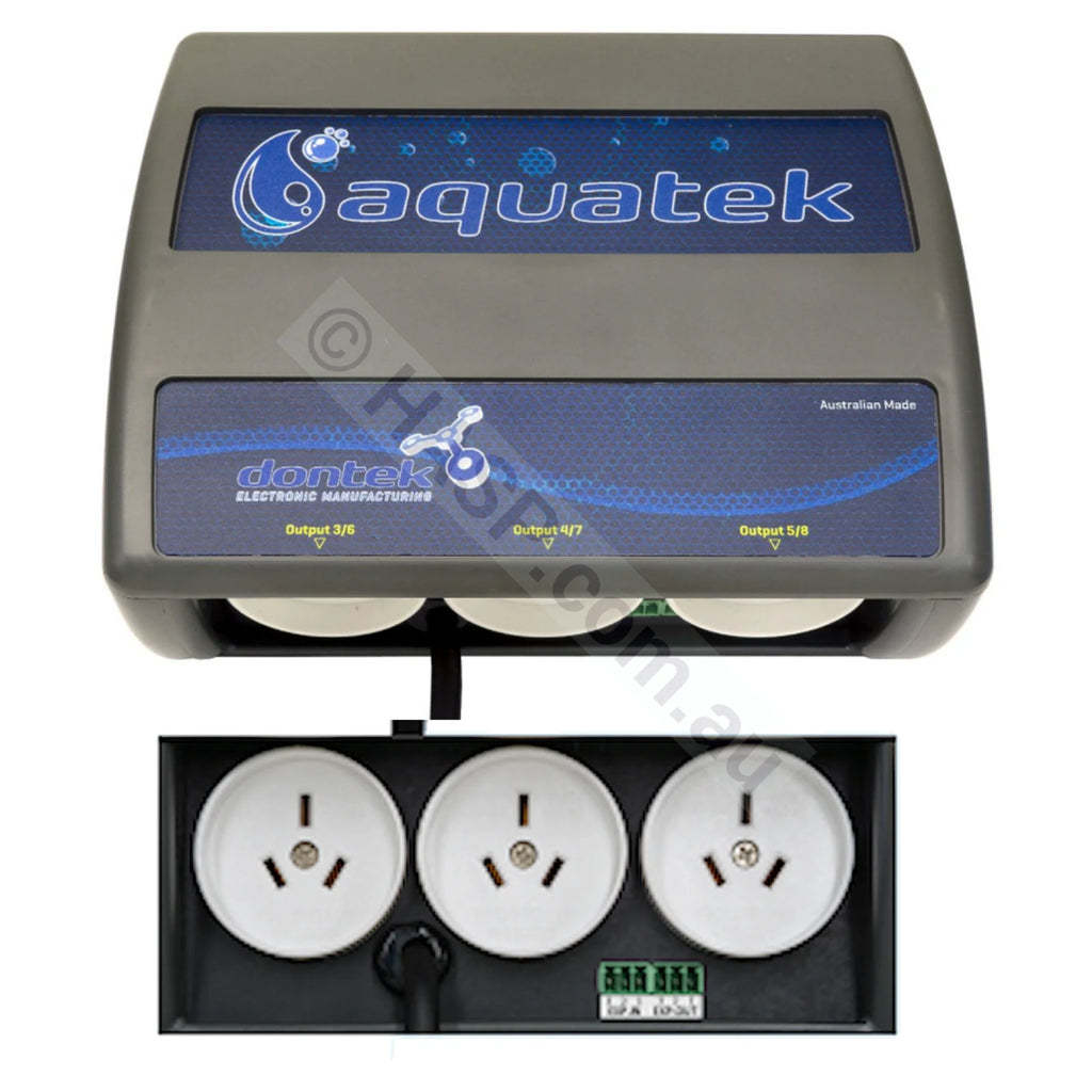 - Each Slave Controller adds three more 240V outlets (10A or 15A), and up to two Aquatek Slave Controllers can be connected.