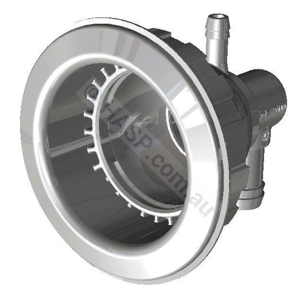 Edgetec Exhilarator Jet Body. Originally grey or black. Now white. Used on Maax Spas, Lanark Spas and others. Edgetec Exhilarator Jet Body designed for 3/4"/19mm hose water and 3/8"/9mm hose air Hole size required - 95mm Used on Maax Spas, Lanark Spas and others
