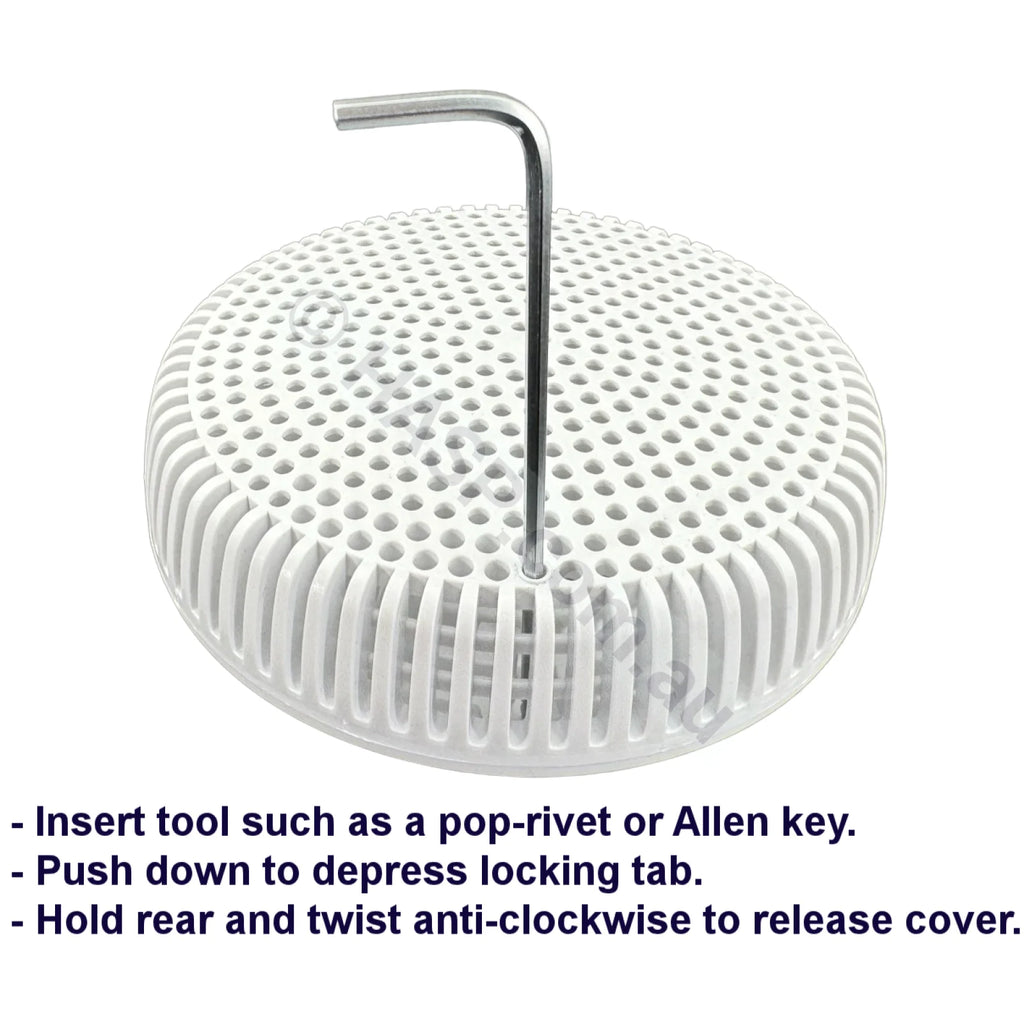 Edgetec suction Australian approved flow rate of 192lpm. 100mm diameter cover. Sits approx 24mm off wall of spa bath. Common on Lanark spa baths, and others. As of 2024, these are now "stark white." Female threaded wall fitting suits Edgetec suction body only.