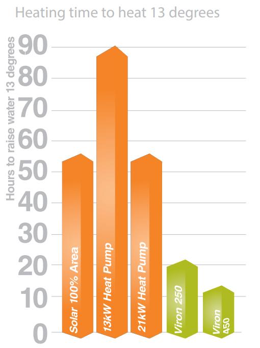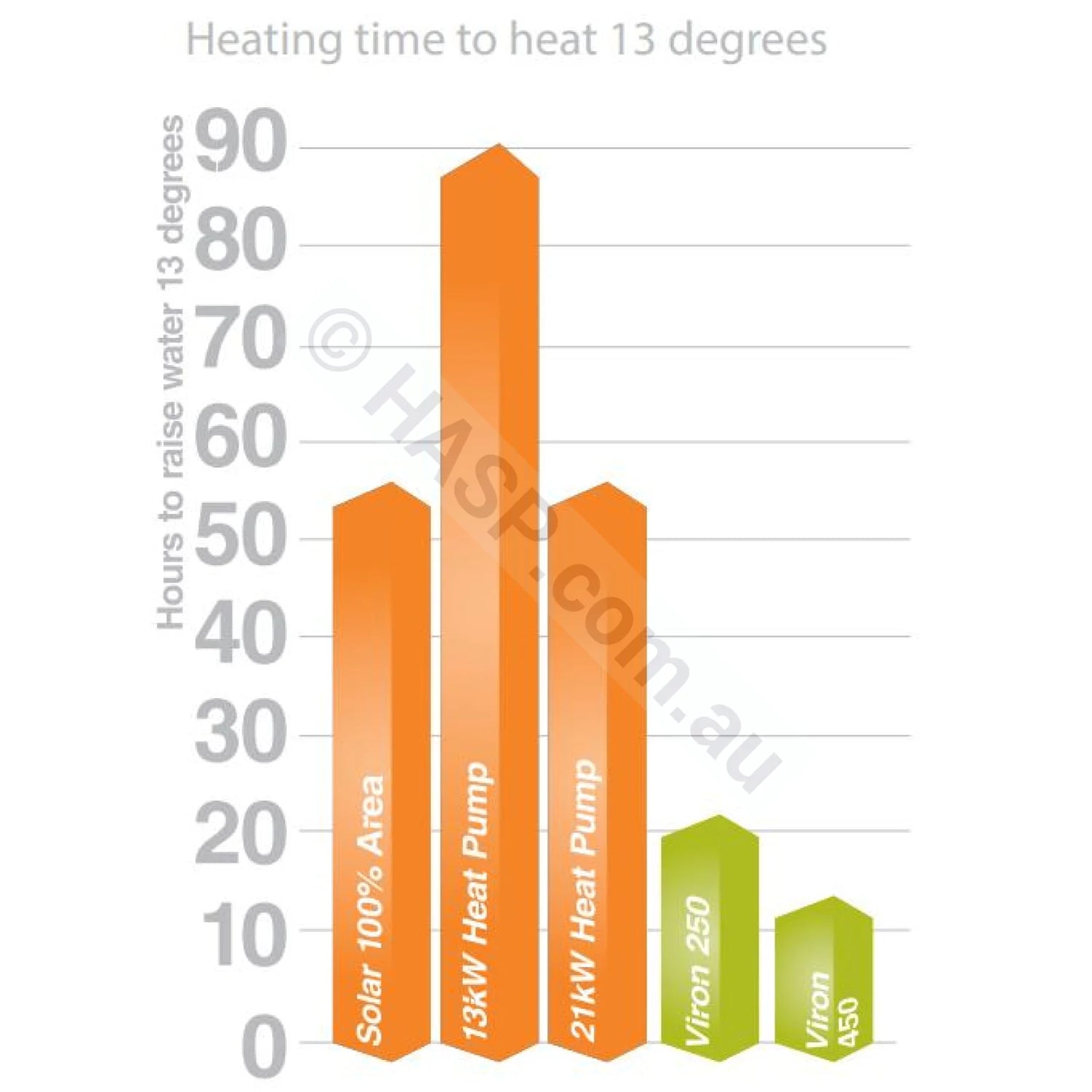 The Viron Pool and Spa Heater squarely faces the issues of greenhouse emissions, energy efficiency and water sustainability all in one compact unit. With operating efficiencies of up to 97%, Viron reduces operating costs by more than 20% over conventional gas heaters.