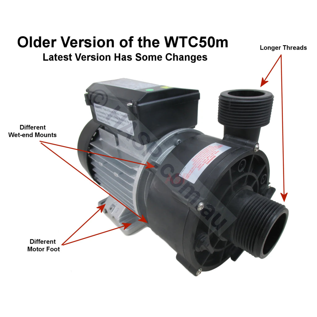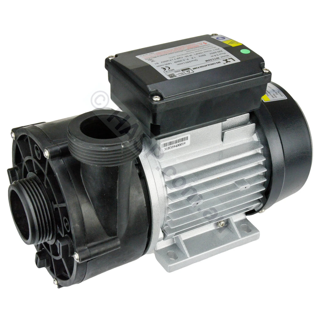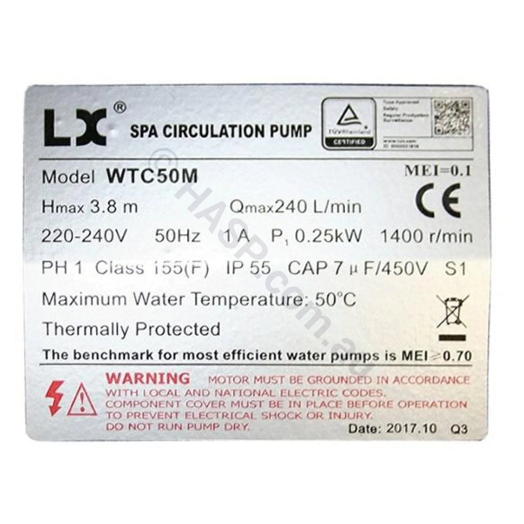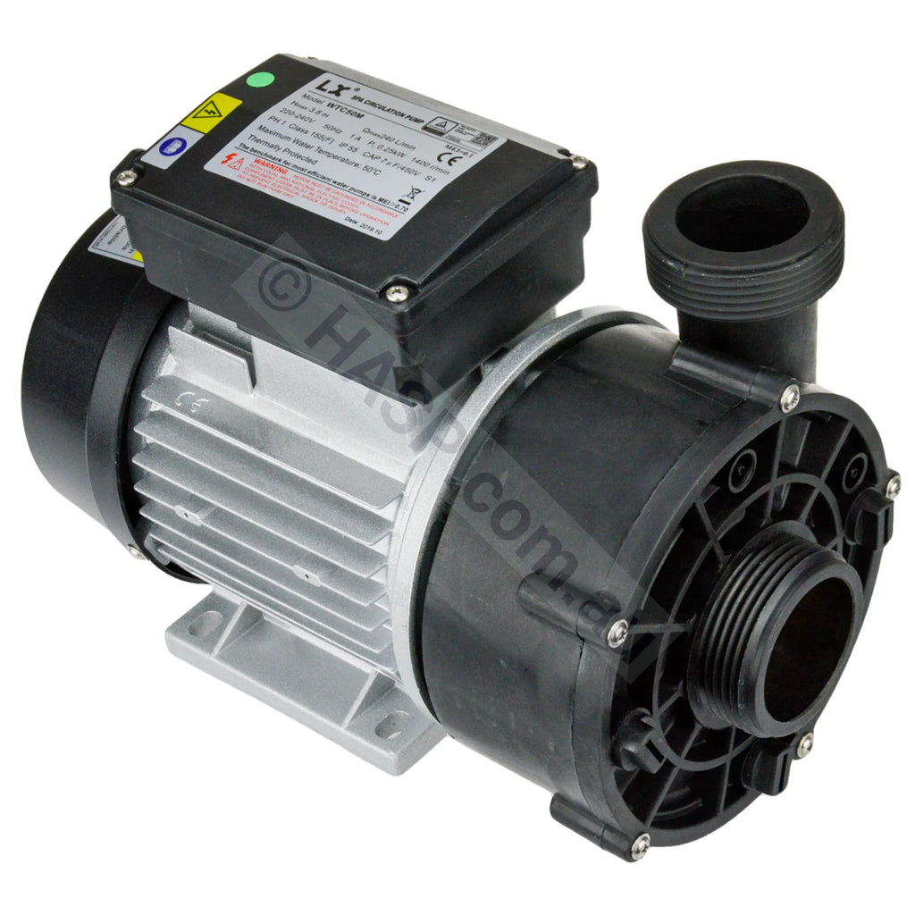 LX WTC50M Spa Circulation Pump found on imported spas. Note that there are other companies selling the same model, cheaper, but with very low-grade seals. LX is an OEM manufacturer that sells various grades under the exact same model name. This is the up-spec'd version. Note that older versions of this pump had some differences. The old version is no longer available.