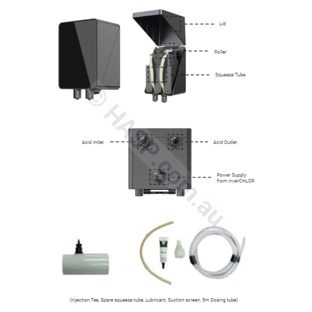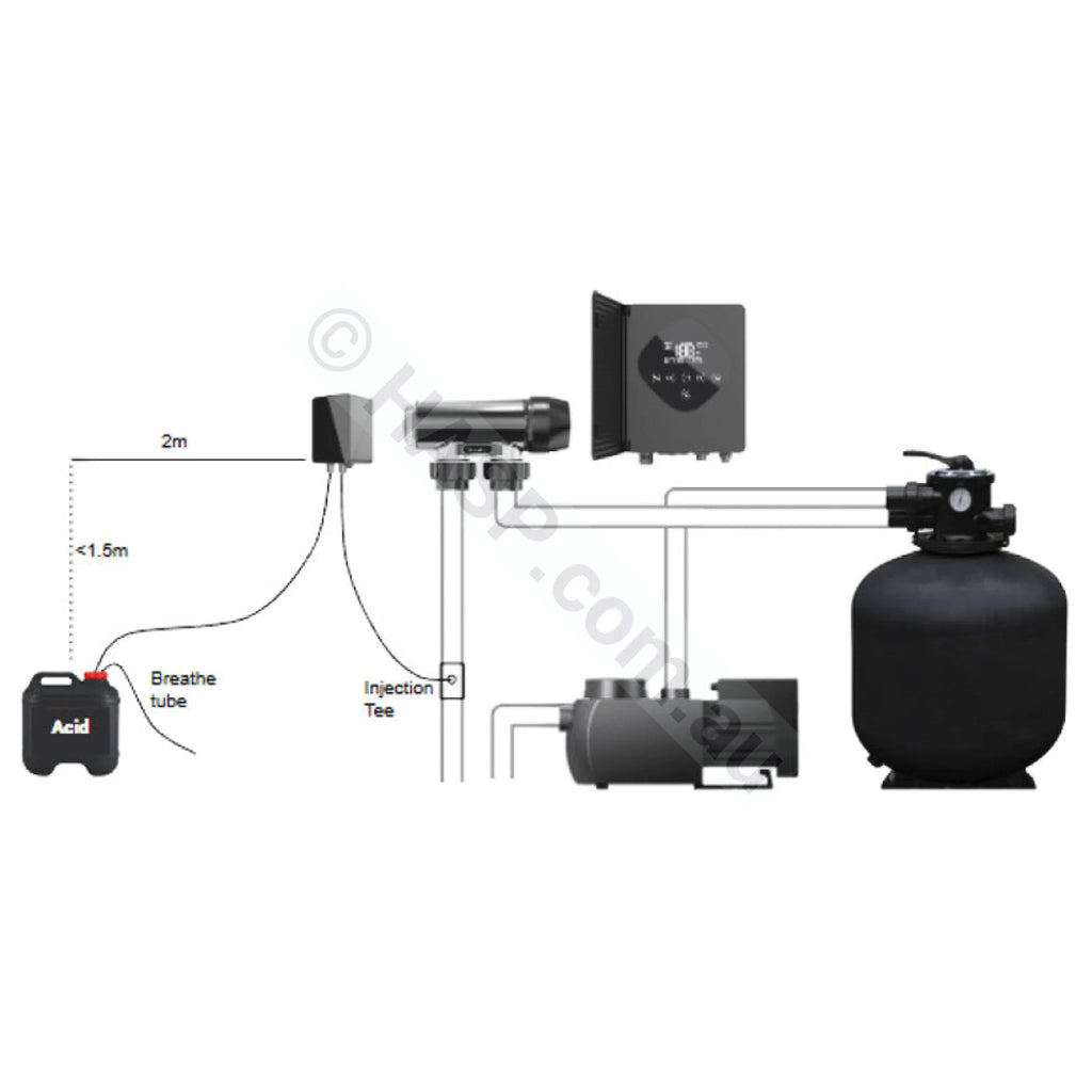 The perfect pH Doser (acid feeder) for the Madimack chlorinator. No need for probes, this system uses an advanced algorithm to calculate how much acid needs to be dosed for your pool.