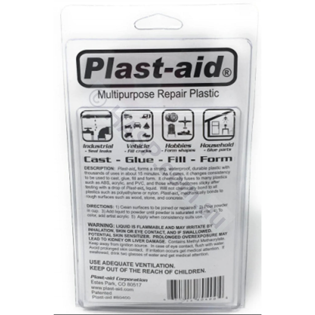 2-Part Plastic Repair for PVC, acrylic, ABS, poly-carbonate, and other Plastics. Perfect for external leak repairs of plastic and acrylic parts under pressure. No need to replace cracked fittings. Clean and apply Plast-Aid on exterior of fitting for lasting seal and repair.