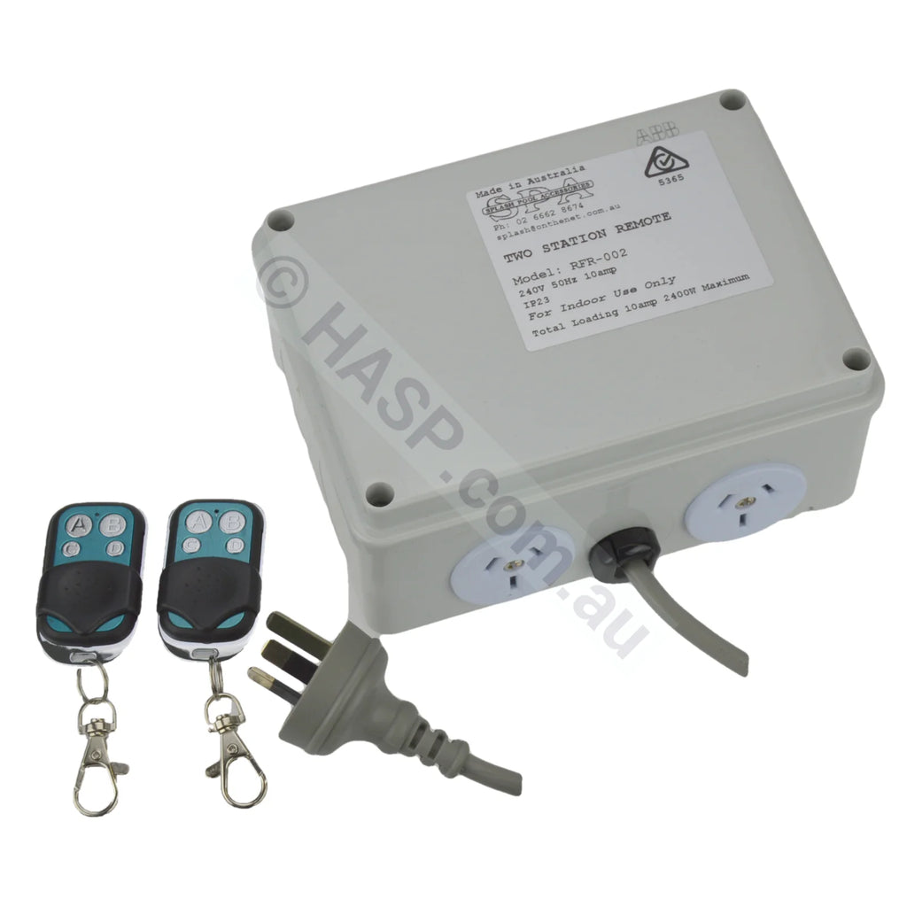 Dual RF remote control unit, supplied with 2 x handheld transmitters. Control 2 seperate components remotely via remote control transmitter such as spa blower and light.