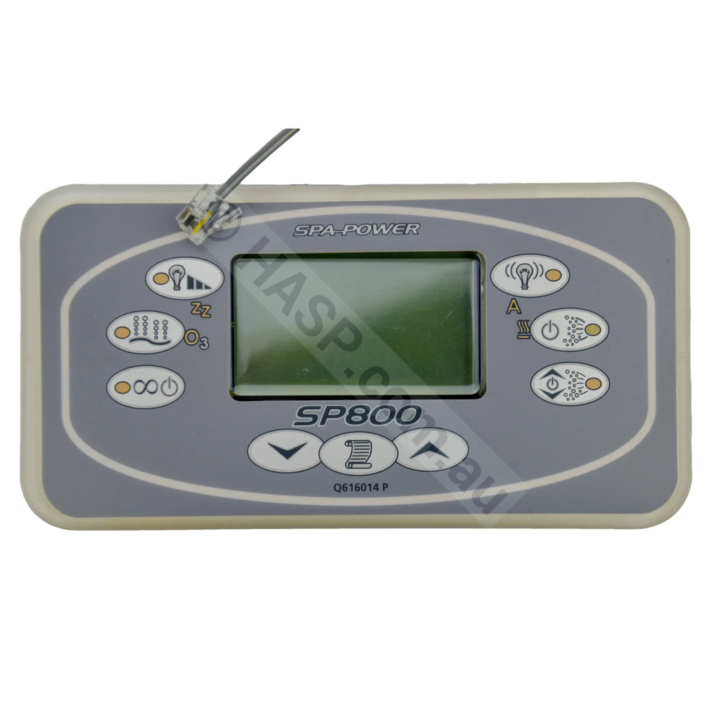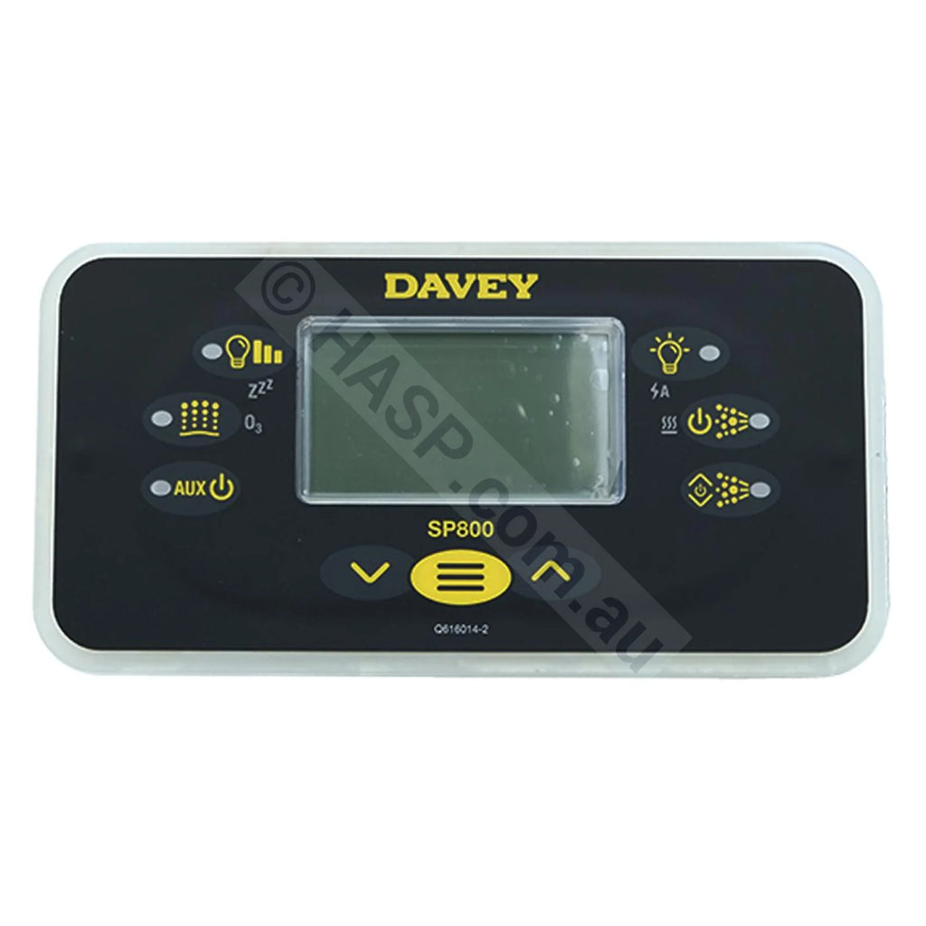 Davey Spa-Quip Spa Power SP 800 touchpad / control pad / keypad. SP800 is also sold as a Tech 980. These were re-branded and used by Sapphire, Heritage, Jaden, Pacific, Maax, Monarch, Lanark, Endless™ and other spa brands. The touchpad are the same, but with different decal stickers.