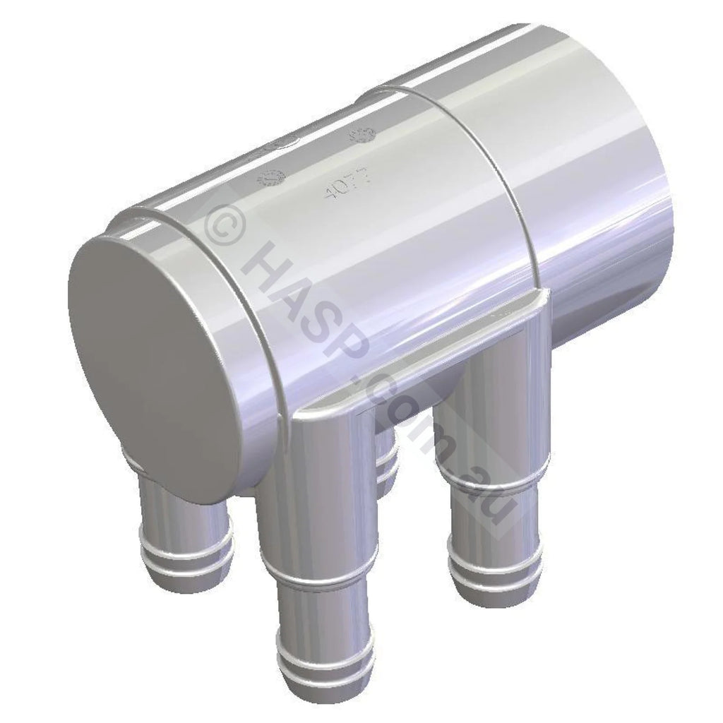 4-port Water Manifold for jets with built-in end cap. These are the manifolds used to distribute jet pump flow to each individual jet. Most common size used on all spas. Has standard 50mm inlet with 19mm / 3/4" nipples.