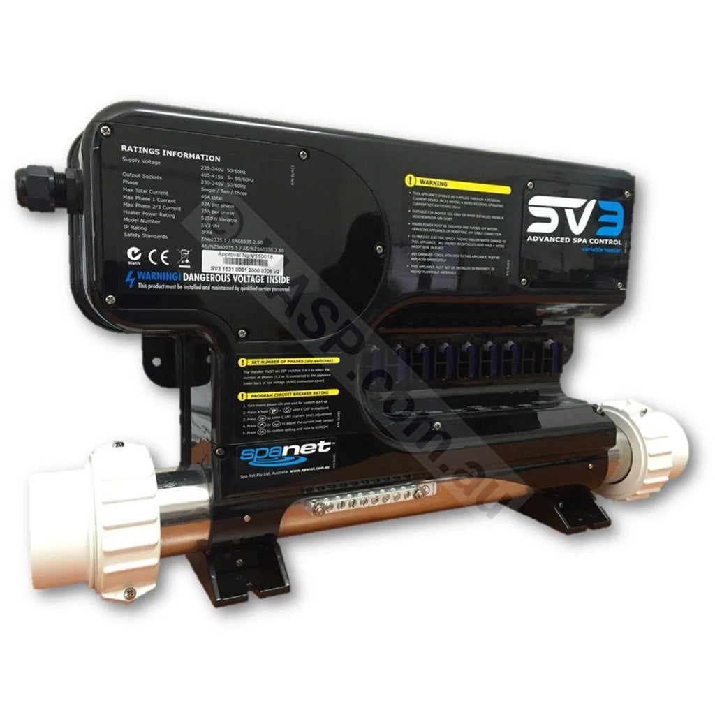 he new SV3-VH spa control featuring a 6kW Smart Variable Heater. Make optimum use of lower current power supplies. All SV Series controllers come with the following featurers: Multi Phase Capable, Heat Pump interface, Power Save Technology.