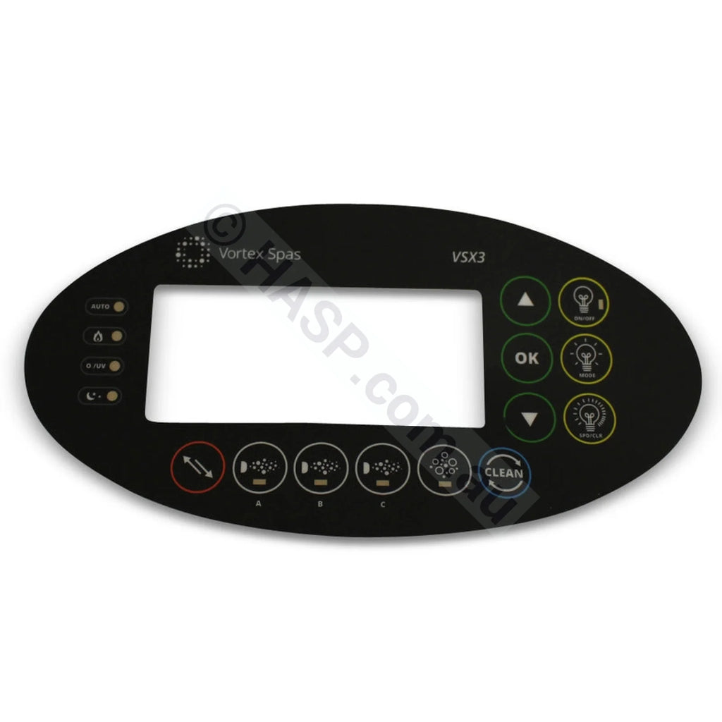 Spanet SV3, SV3-T, VSX3 Overlay Decal Sticker. May have been black, blue or gray. Also were custom printed for various spa manufacturers. New ones may be any of those colours, depending on availability.