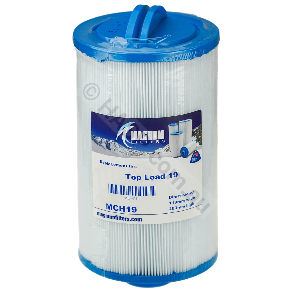 Spas Direct MCH23 and Stoked Spas MCH19 filter cartridge replacement. 1.5" MPT threaded pleated filter cartridge replacement. Was originally 200mm high x 118mm diameter. New version is 168mm high x 125mm diameter.