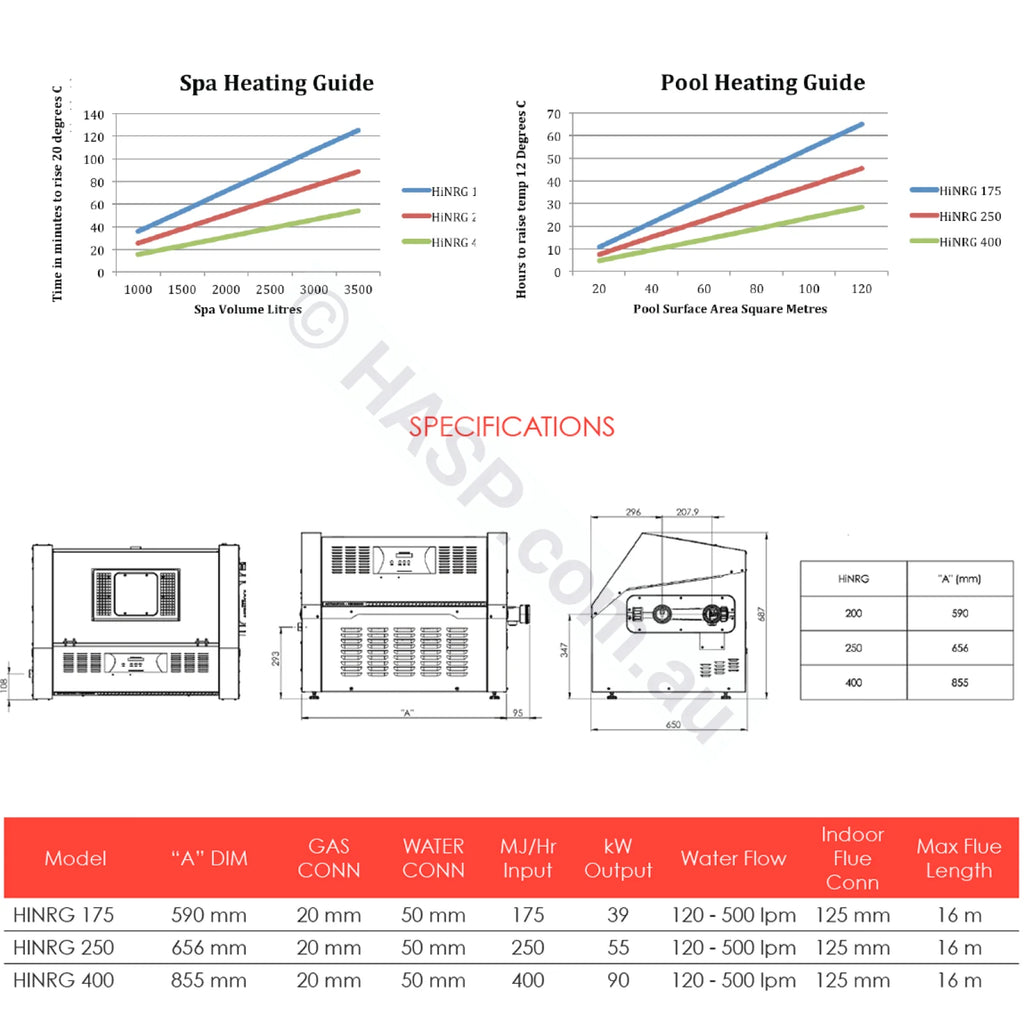 Astralpool HiNRG 175 gas pool and spa heaters. Available in both Left & Right-hand manifold versions. LPG & Natural Gas. Early models were blue, and now are gray. These are a very efficient, fan-forced heater that are easily converted for indoor use with the appropriate flue kit.