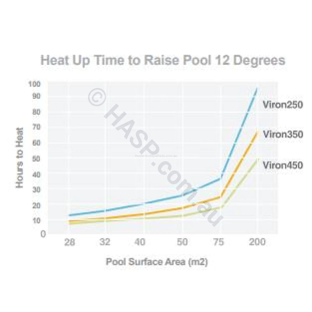 The Viron eVo Pool Heater requires a minimum of 250 litres per minute flow for 250/350 models and 350 litres per minute flow for 450/550 models. The maximum permissible flow rate is 500 litres per minute. For flow rates in excess of 500 litres per minute, an external by-pass valve must be fitted.