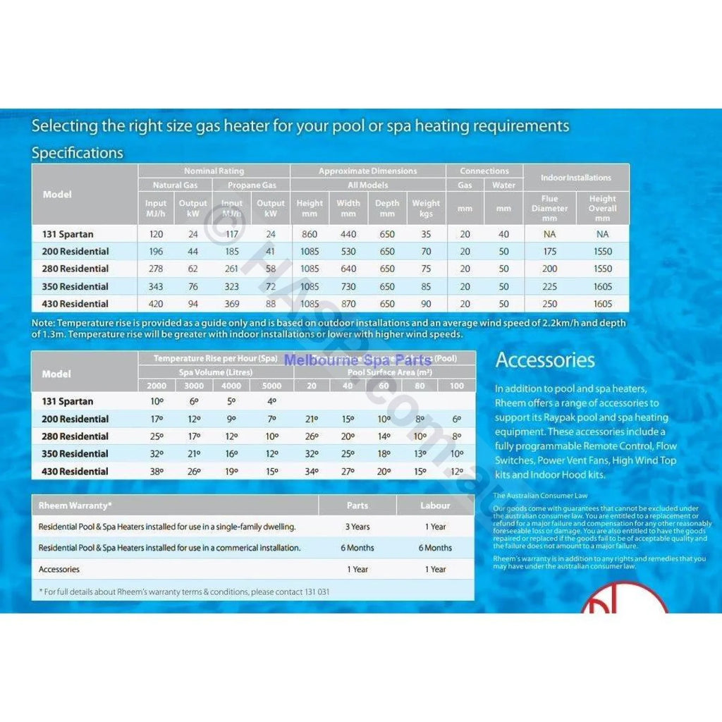 - We do not recommend the newer Raypak 280, 350, 430 gas heaters be installed where 40mm plumbing is used. Flow characteristics have changed in the newer heaters.