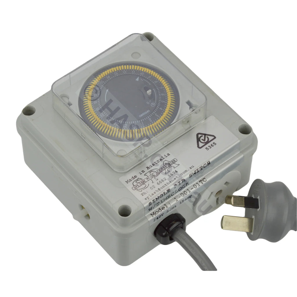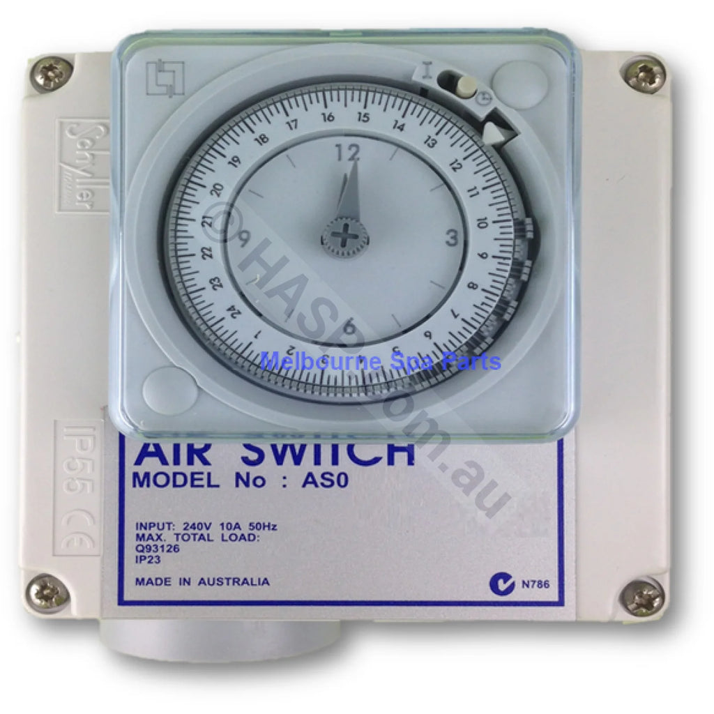 Single Air Switch Controller with Time Clock. Australian made. Spa or pool equipment controller complete with 24-hour timer. Electronic air switch which you can plug in your air blower, pump or lights etc. to operate safely via an air button switch (not included) from your spa or poolside.