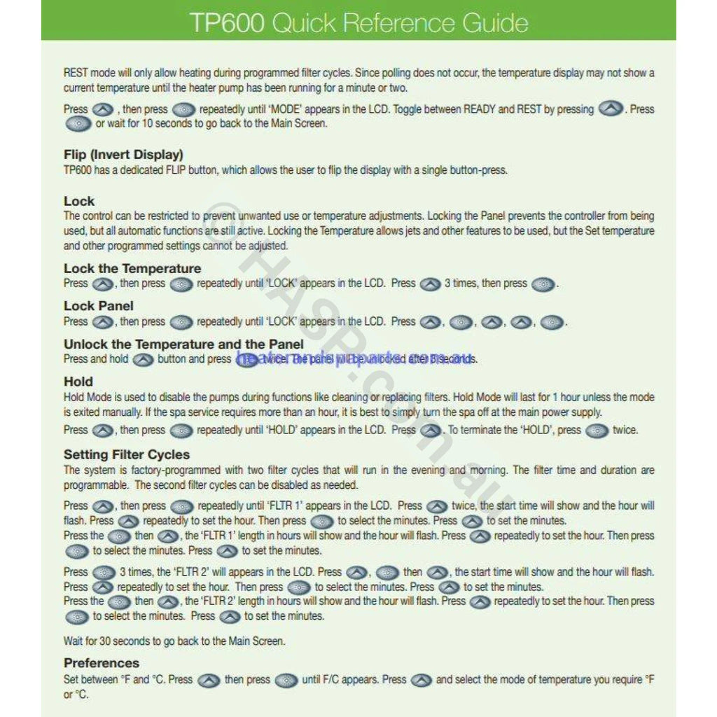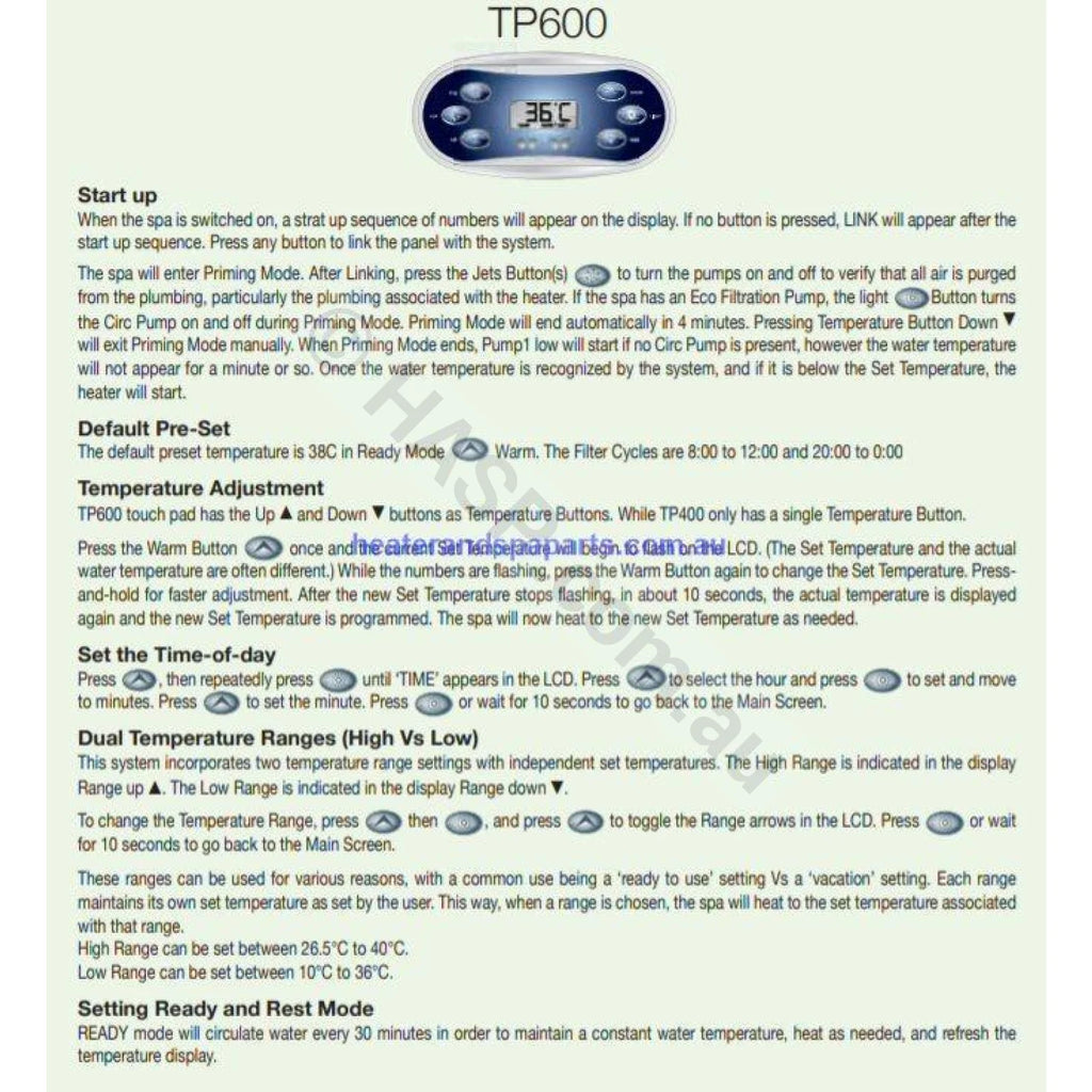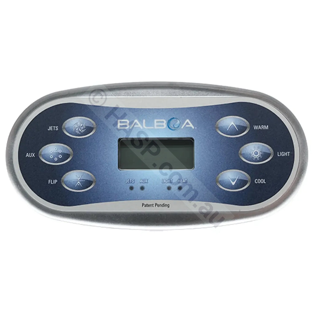 6-button oval Balboa TP 600 spa control touchpad with overlay. Has different labels. 6 button oval shape. Used by manyimporters & Spa Industries (Leisurite, Designer, Cyclone, Prestige, Bullfrog, Signature, Lanark, Spas Direct, SunSeal, etc.). Comes with standard OEM Balboa Overlay Decals. See Notes below.