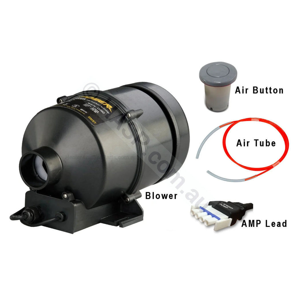 Our exclusive kit comes with a Davey blower with AMP plug, Air Switch & Air Tubing. Simply plug in the new blower into the SPVSB socket of the controller, and fit the Air Button somewhere on the spa (38mm hole required). Press the Air Button to activate the blower On & Off.