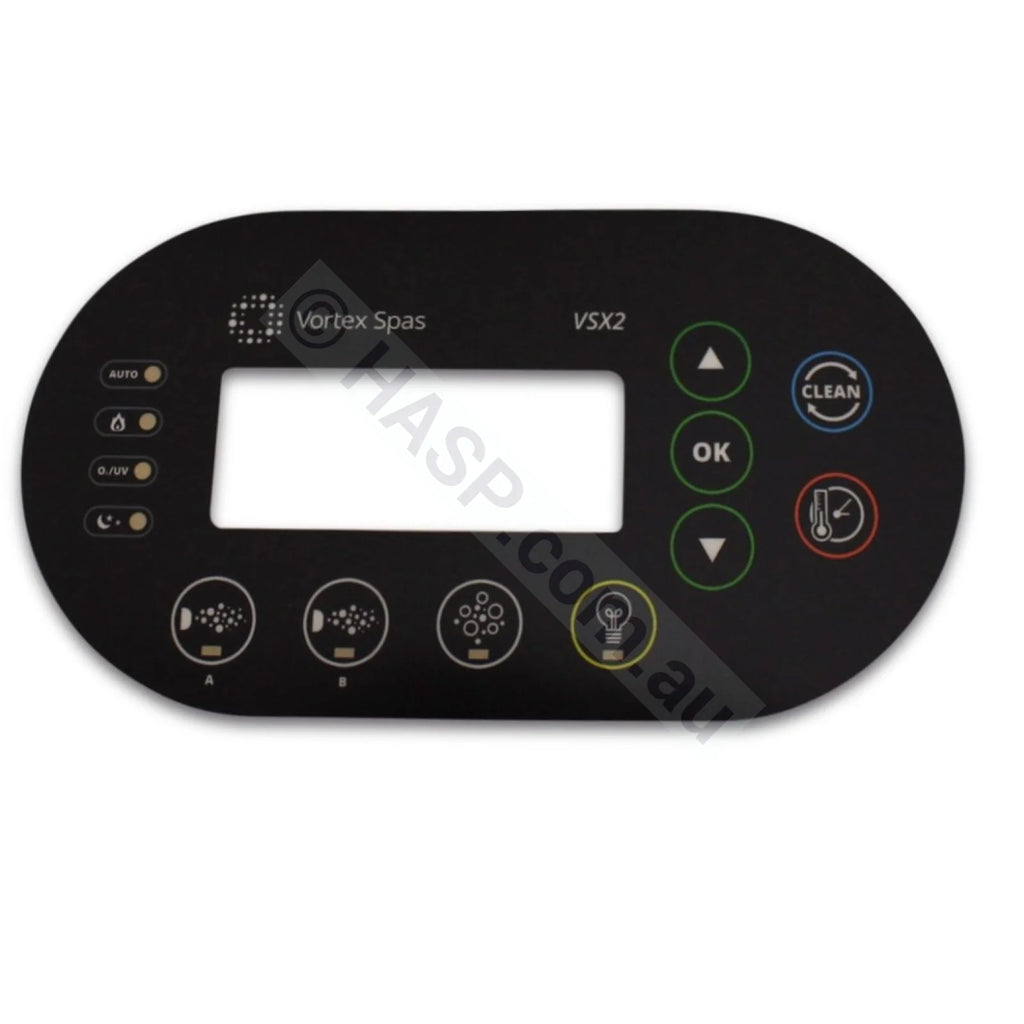 SpaNET SV2-T touchpad with overlay decal Sticker. Also replaces the VSX2 on Vortex® spas. Second and third images show other overlays (sticker) these came with. As of 2024, they come with the light grey overlay.