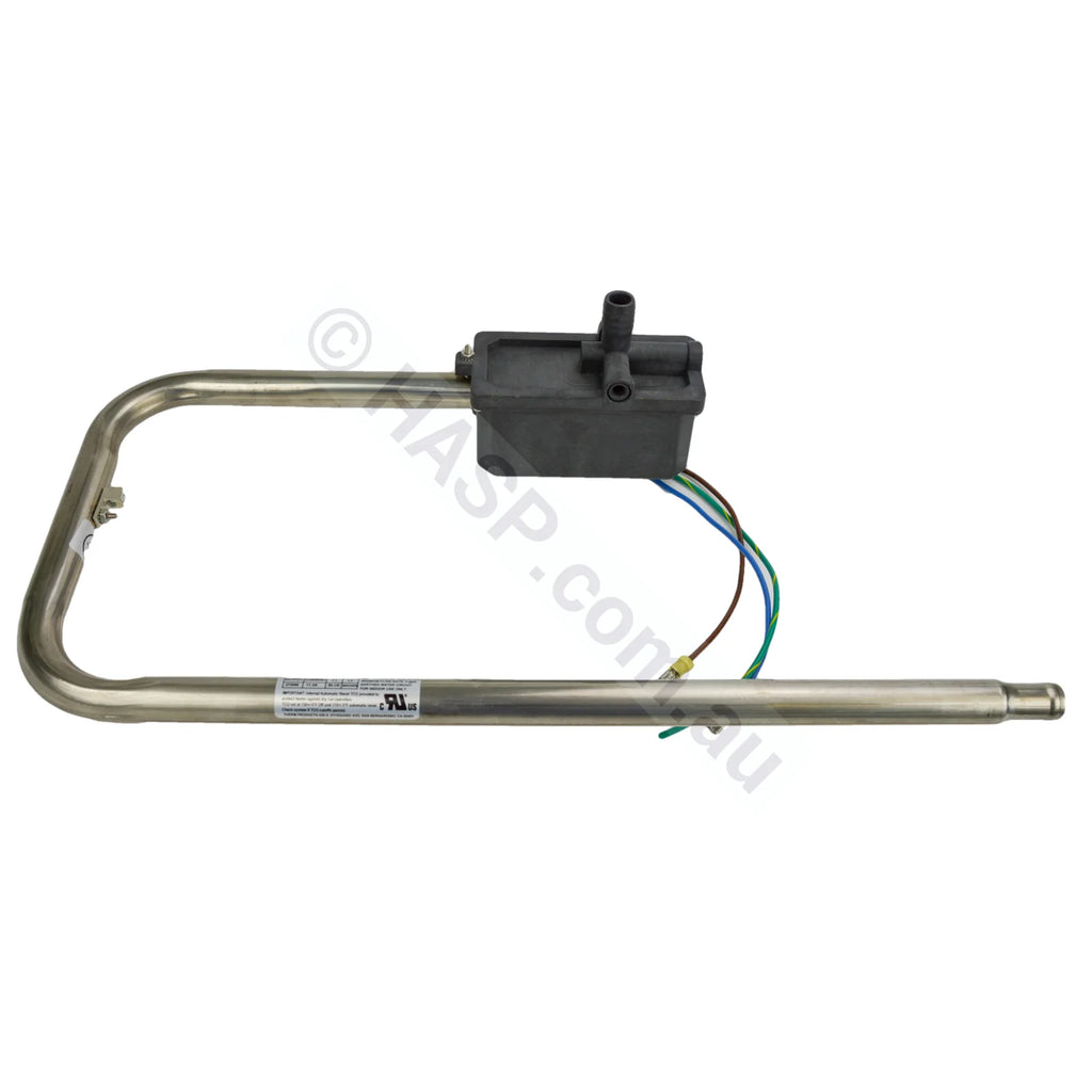 2.7kw circulation style universal titanium heater replacement with threaded pressure switch tap (pressure switch sold seperately) to suit Gecko Electronics SSPA, MSPA-MP spa packs and many other circulation heater applications. aka Trombone style heater.