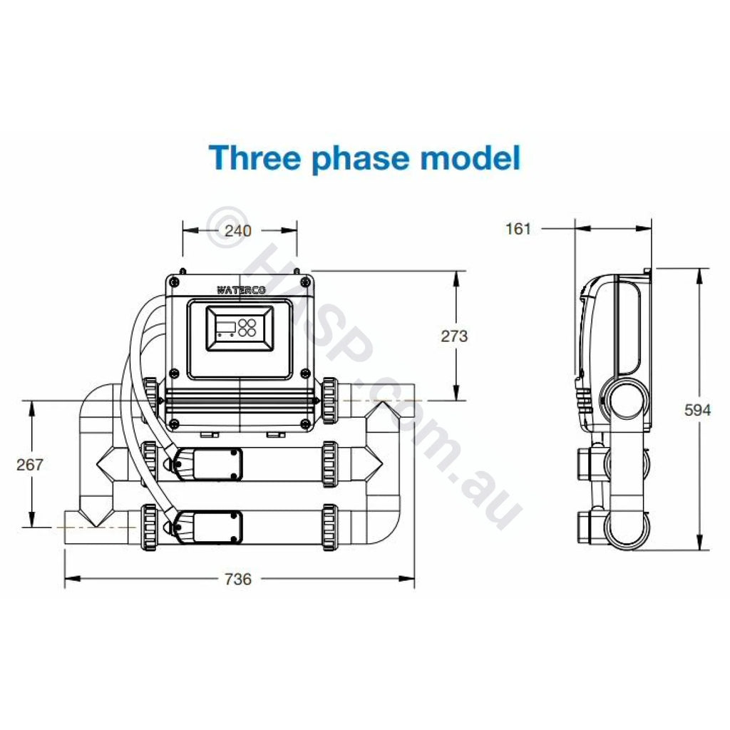 Waterco Digiheat electric heaters for pools and spas. Comes with Titanium heater element. Has pressure switch, and high limit thermostat protection. Digital thermostat for temperature control. Can be wired remotely controlled with home automation etc, or pump interlocked for added safety protection.